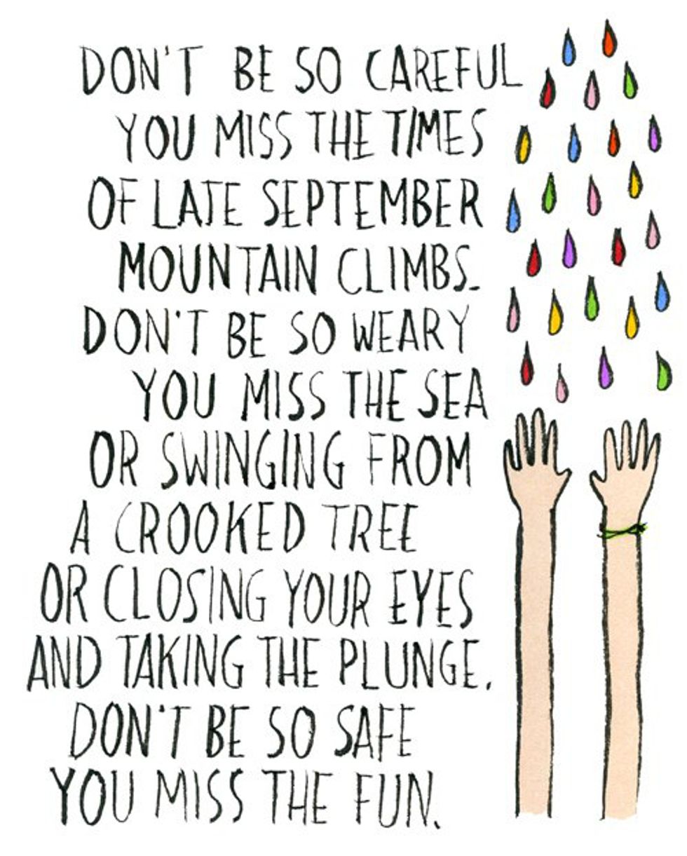 The most profound messages are often expressed in the simplest ways. This is true for artist Dallas Clayton. He is a one of a kind author, illustrator and mural painter. More importantly, he is a happiness and adventure enthusiast who travels the world, spreading his positivity and sharing his ideas with everyone he meets. While he is considered a children’s book author, his work is deep and inspirational, and should be recognized by audiences of all ages. Here are a few of my favorite thought-provoking messages, written and illustrated by Dallas Clayton, and the truths I've perceived from them: