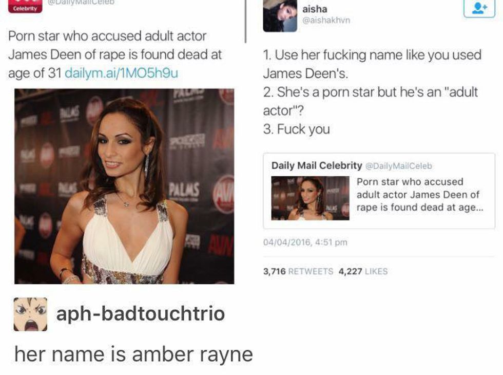 It was four days later that I learned one of the adult actresses who accused James Deen of rape passed away. As Seen On Tinder, a feminist Facebook page shared an image that highlighted the erasure of and showed the double standards against female porn stars. Amber Rayne is her name, and she was the victim in this specific case.