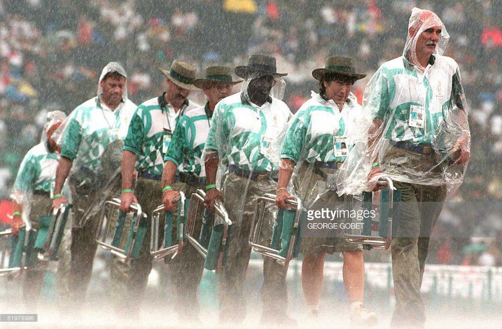 10. Track and Field judges walk through the rain during the 1996 Olympics in Atlanta, GA.