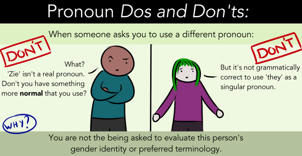 When I tell people that I use they / their / them pronouns the first response is usually, "But that is plural." This is quite frustrating as the people who say that also say things like "sup" and "ain't." The refusal to use these pronouns or adamant condemnation of use is nothing but transphobia though it may be dressed up in excuse of proper grammar. People break grammar rules all the time, and the biggest culprits of this are native English speakers. These same people, after I drop my pronouns like the hottest album of 2016, immediately turn into Oxford educated English professors. Language isn't described by natural laws. We can't look at the genes of the word "they" and conclude that it has the plural allele. "They" is a random sequence of letters that has historically been used to refer to people in the plural. It has now become necessary, just as the addition of "she," to use "they" as a singular pronoun.