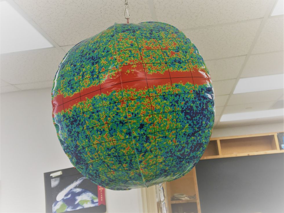 There is a story here, waiting to be told. Is it in the false-color thermal globe—inflatable—that dangles on a yellow lanyard from the ceiling in the middle of the geocentric room in our heliocentric system? Paperclip at the north pole, askew.