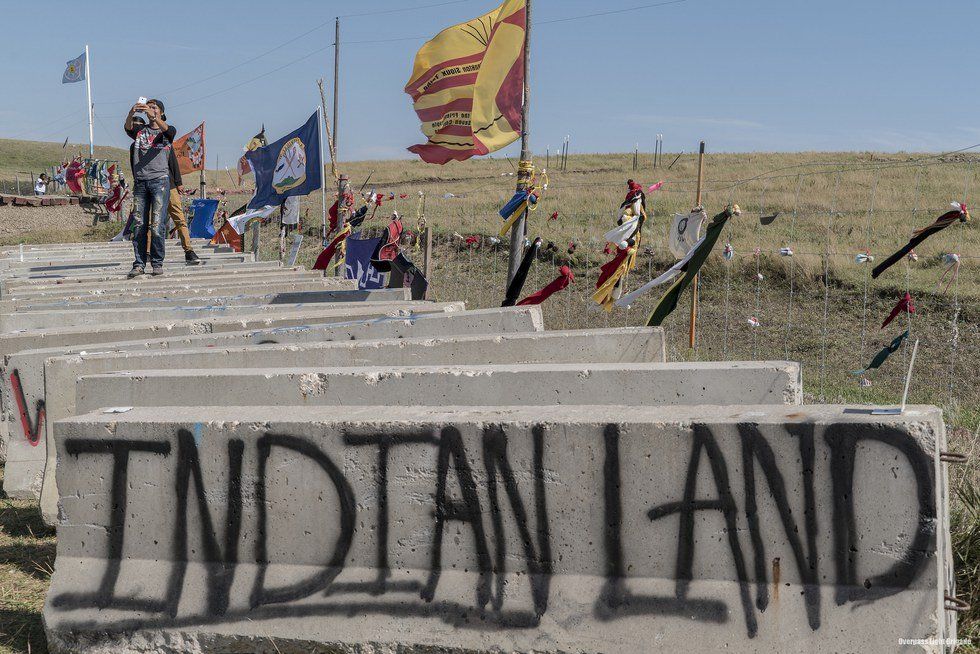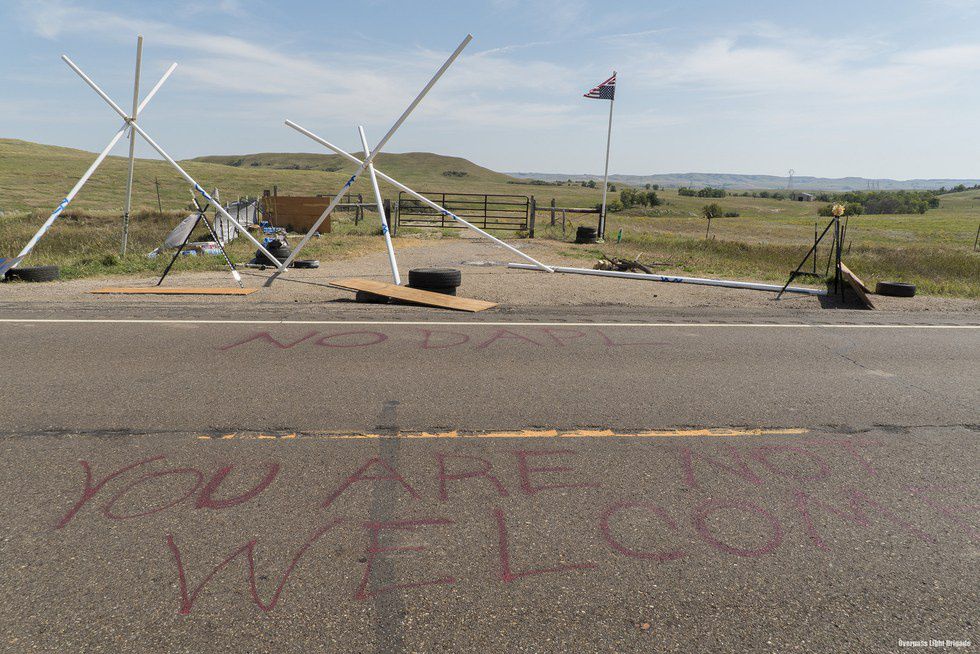 Today, a similar message can be seen scattered across DAPL construction sites in North Dakota. Unlike their San Franciscan predecessors, Dakota Access protestors extend no courtesy in their demands. One sign spray painted in front of the gate of a construction access road reads "No DAPL. You are not welcome." With the company's recent desecration of sacred burial sites, there's indeed little to be glad about the pipeline's construction, which protestors see as a threat to the cultural history of the Standing Rock Sioux tribe and the environment. "How do you eliminate a race?" Dave Archambault, chairman of the SRS Tribal Council asked, "That's what the government has been trying to do for 200 years. But we're still here. We have maintained our culture . . . our way of life. We're still here." It's this determination that's recited in the graffiti painted and hung on equipment, barricades and road signs across DAPL construction sites.