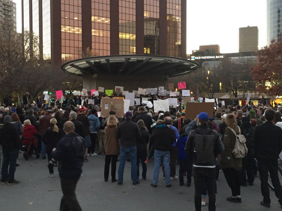 Thursday from 5:30pm to 6:30 pm I was at the #notmypresident rally that was started by a GVSU student in Rosa Parks circle. It was 50 degrees, overcast and windy. It was a diverse crowd, much more diverse than the panel audience, and there were people of all ages from children under ten to people over 50.The Panel talked about why the election ended the way it did.The Rally talked about what was going to happen after President-Elect Trump is sworn in.