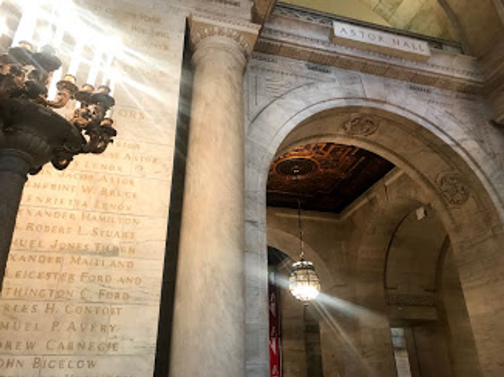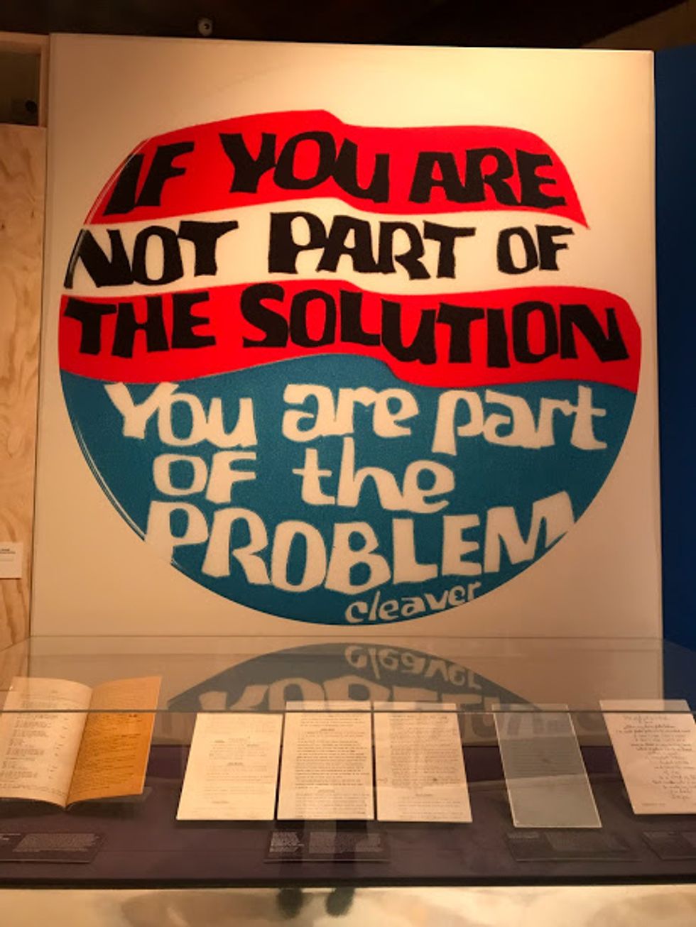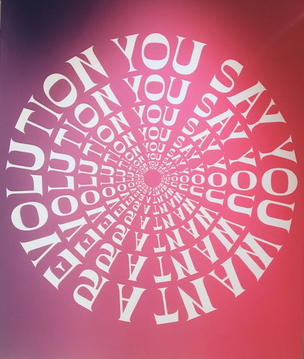 As I walked into the library, I was immediately awed by the grandiose arches and ornate marble that assaulted my eyes. It was so beautiful and stunning; however, far in the back behind the arches, I noticed a sign of purple and pink with white letters swirling into a seemingly endless circle. From afar I couldn't tell at all what the sign said, but as I got closer I could finally read what it said: "You Say You Want A Revolution." Instantly, with this subtle Beatles reference, I was drawn into the exhibit a man working at the library happily told me was free.