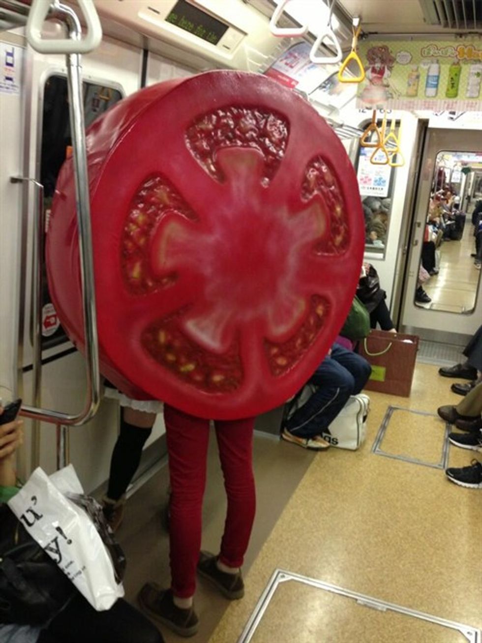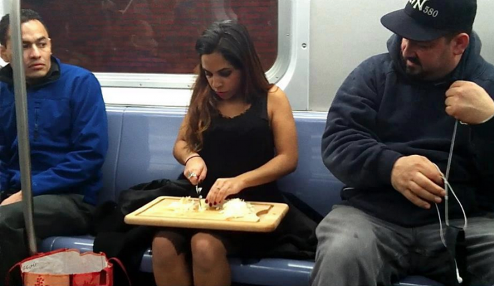 Multitasking at its finest, but it's probably not the wisest choice for a subway car. I wonder what was going through this woman's mind as she decided to get a head start on preparing her dinner? I wonder what the guys next to her were thinking?