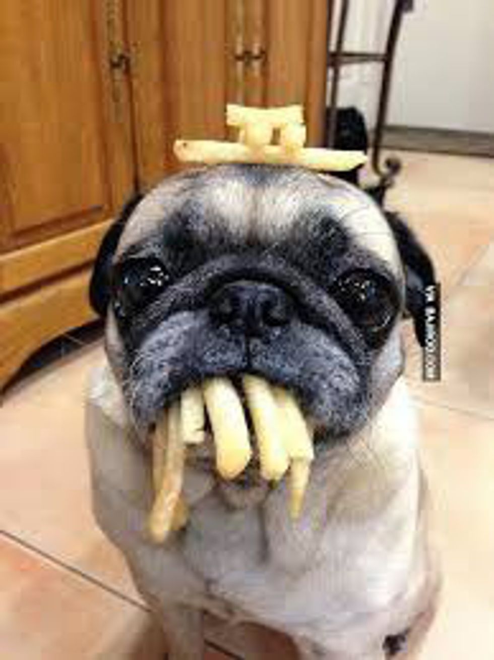 I like this pug's aesthetic. He is quite the guy with all his fries. In fact, he appears to be super happy with his fries, as well. I hope they are good fries because he deserves only the best.