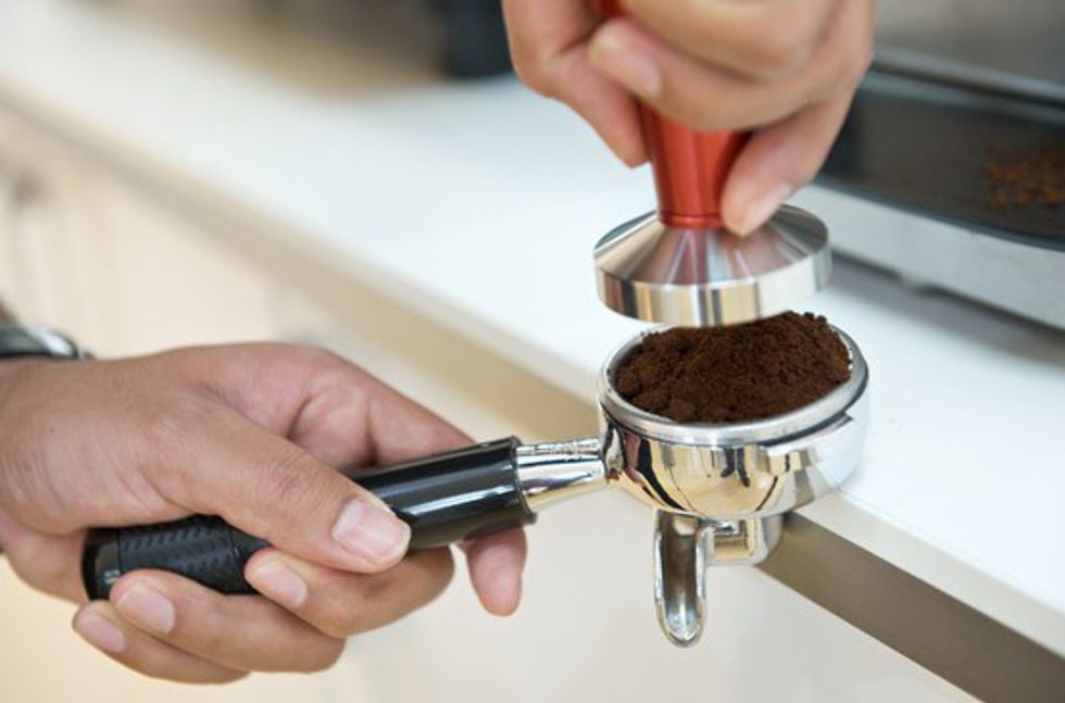 First, you need to distribute the coffee evenly -- it needs to be flat all the way around, and there are various ways to do this, including brushing the cone off the top or tapping the portafilter with your hand a few times. The espresso machine you bought should have come with an espresso tamper, but regardless of whether or not you have one, it is important that you tamp (or press down on your espresso with a flat surface) every time. The amount of pressure you use affects how fast the shot pours, which affects the quality of the espresso. If the shot pours too fast, you didn’t press down hard enough, and it will be bitter. If the shot pours too slow, you pressed down too hard, and it will be bitter. That 27-to-30-second mark is so, so important. What I’m telling you is, it’s a balance, and one variable being out of whack will make it all come tumbling down. You'll notice that the person is holding the tamper very precisely, like a flashlight. I have tendinitis and that puts strain on my wrist, personally, but I still make good coffee -- just hold your tamper in a way that works best for you.