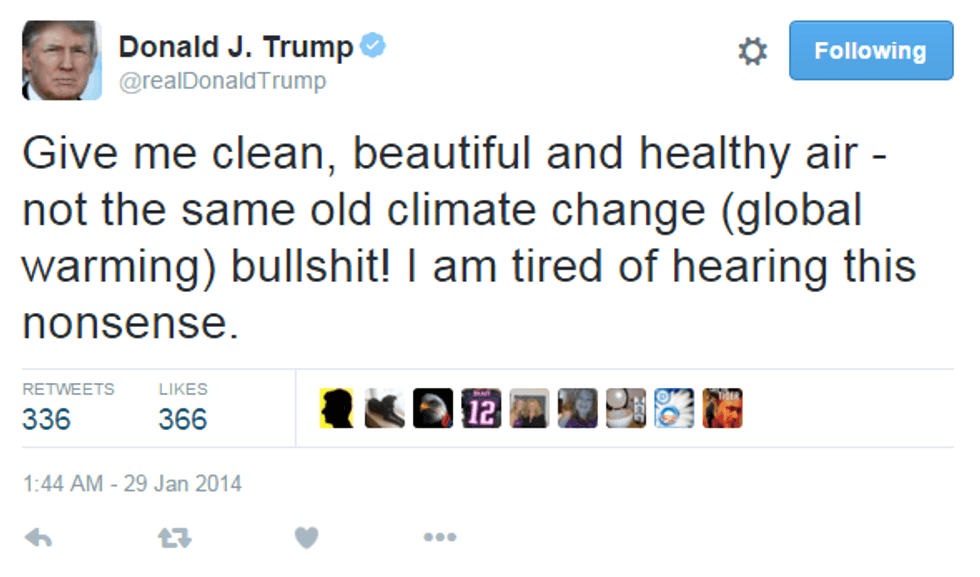 Yes, you did. Several times. Trump's original 2012 tweet declared that global warming is a concept “created by…the Chinese in order to make U.S. manufacturing non-competitive.” He has since backed off from this, claiming that it was a joke. Where’s the punchline? Nowhere, apparently, because he went on