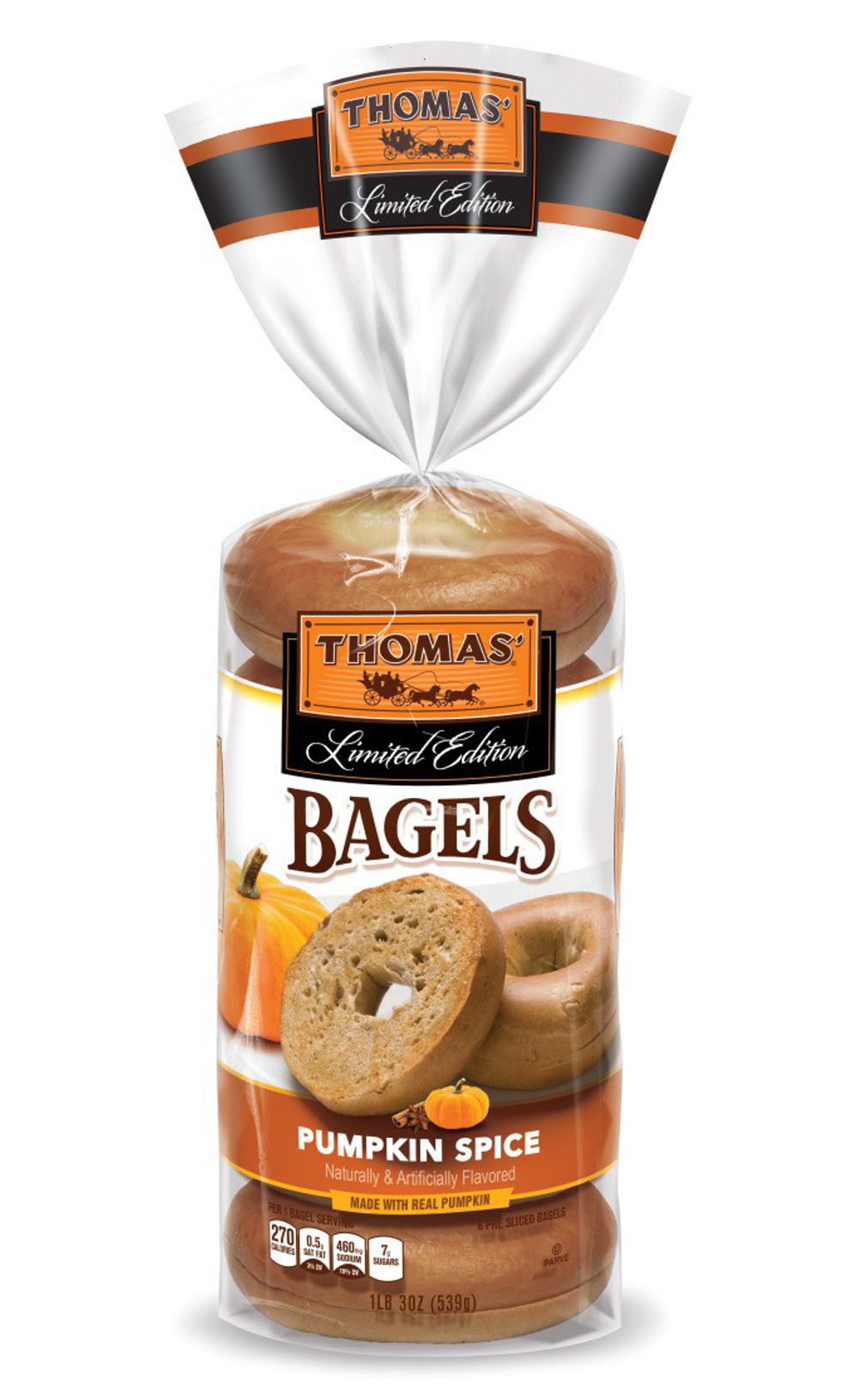 There are many different brands that carry pumpkin spice/pumpkin flavored bagels. Every single one of them is good. Pair this with butter or even some cinnamon cream cheese and prepare for pumpkin heaven.