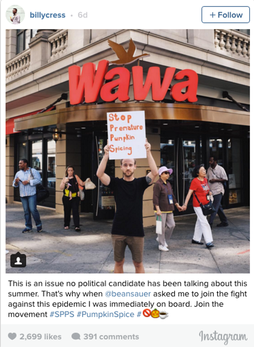 This guy, Billy Cress, started #stopprematurepumpkinspicing after posting this photo on Instagram, which quickly received thousands of likes in support. Those in favor to stop "premature pumpkin-spicing" believe that this beloved flavor of fall should stay where it belongs. Technically, fall doesn't begin until September 22nd, so why would you rush for your pumpkin spice latte in the middle of summer? The PSL, iconic as it is, is a fall staple and shouldn't get a free pass into the summertime. You wouldn't wear a warm scarf in the middle of June, would you? Let's not even get into the fact that Pumpkin Spice Lattes hardly contain any pumpkin at all.