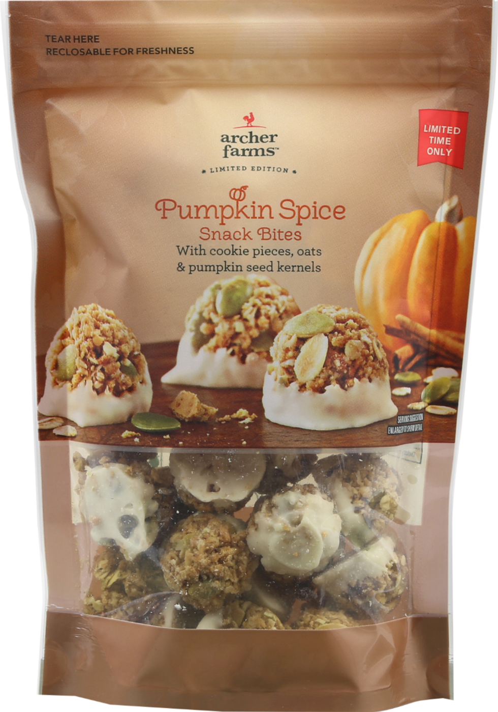 These pumpkin spice-infused treats feature cookie bits, oats and pumpkin seeds, all rolled up and partially dipped in a white chocolate-y coating. You can only find them at Target.