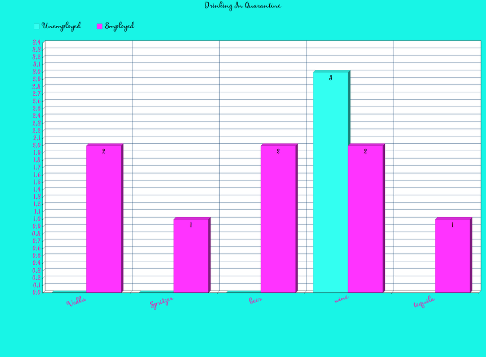 During the early spring of 2020, the world had seen an outbreak of COVID-19. This had a worldwide impact on almost every country. During this time we had seen the loss of many jobs and the beginning of the quarantine. Being Stuck indoors 24/7 only surrounded by the people you live with, is enough to drive anyone bonkers. A lot of people had the privilege of working from home, but then there are people such as myself who have been unemployed since late March. So how does one cope with this? The answer is simple, by making a quarantini. A quarantini is when a person drinks almost, if not nearly every night. I had the pleasure of Surveying 11 people on Facebook to see the time of day they were participating in this, the drink of choice, and if they were employed or not. Below is a graph of the survey on Facebook.