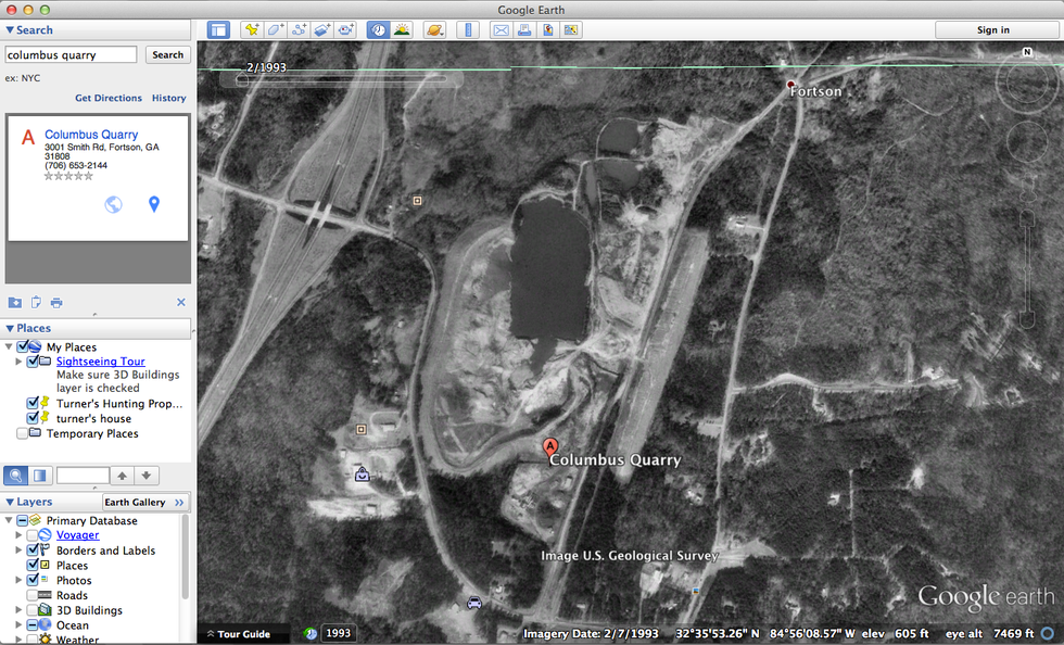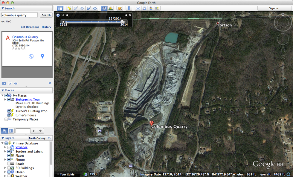 Columbus Quarry, as captured by satellites in 2014. You can notice expansion to the east of the quarry and more layers dug deeper into the pit.