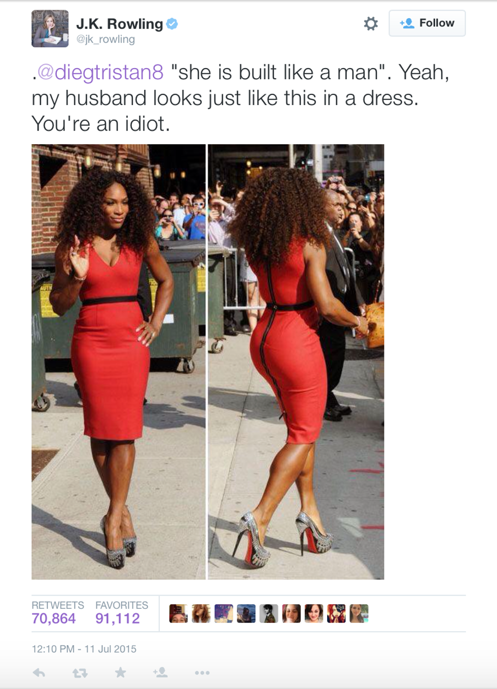 J.K. Rowling has an incredible way with words, especially when she puts her words together to put a hater in their place. Yesterday, Rowling called out one particularly rude Twitter user, @Diegtristan8, for saying Serena Williams' victory was only attributed to her being "built like a man." Flawlessly, Rowling sent him back to the dark corner of the internet where he came from with one simple tweet.