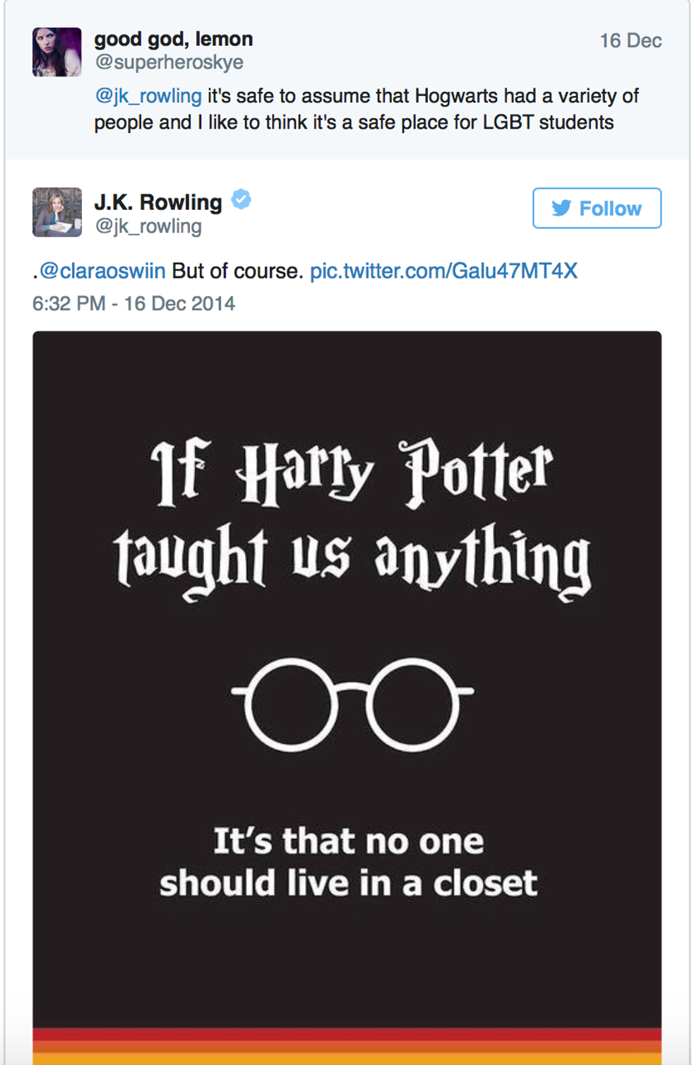 J.K. Rowling does not care whether you are magical or muggle, she believes everyone should get to marry who they want. In today's culture, when a celebrity backs a cause like Gay Rights, such support can really help move it forward. When J.K. Rowling announced to the world that Dumbledore was gay, it was referred to by the Toronto Globe and Mail as "the biggest outing in the entertainment industry since Ellen DeGeneres."