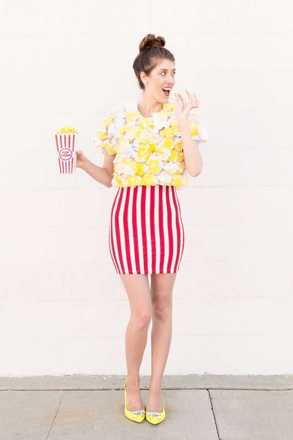 You’ll crumble up the yellow paper and super glue it all around the shirt to look like popcorn. Then pair the whole costume with some cute yellow flats or heels!