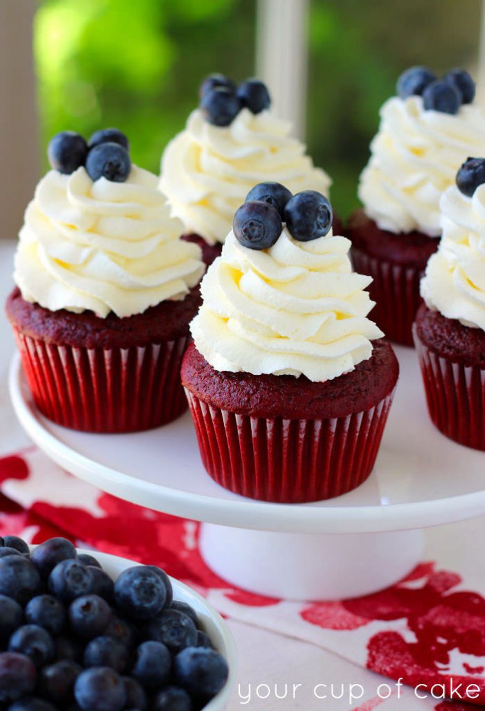 You can make these red velvet cupcakes from scratch or use a box mix. Top the red velvet cupcakes with your favorite vanilla or cream cheese icing along with a few blueberries to represent the red, white, and blue.