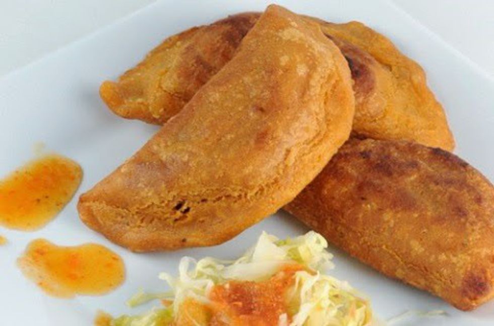 A turnover stuffed with either ground beef, ground chicken, or vegetables.