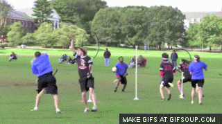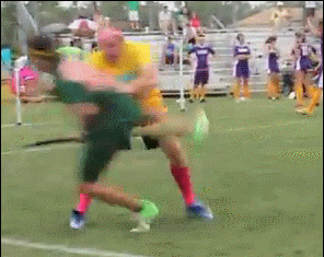 I am sure by now that avid fans of the Harry Potter series are wondering, "What about Harry's part and the snitch?" Well, this is where Muggle Quidditch gets interesting. The two seekers stay off field until the snitch is released. The snitch, however, is a player dressed in all yellow with a sock-like tail holding a tennis ball attached to the back of his shorts. The goal of the seeker is to yank said tail off to gain 30 points, often winning the game for his team. There is truly no way to describe the battle between snitch and seekers. It's a bit like wrestling mixed with some long distance running, usually done backwards by the snitch. Often times, a game will end with most spectators rooting for the snitch not to get caught so as to keep the other game play going in the background.