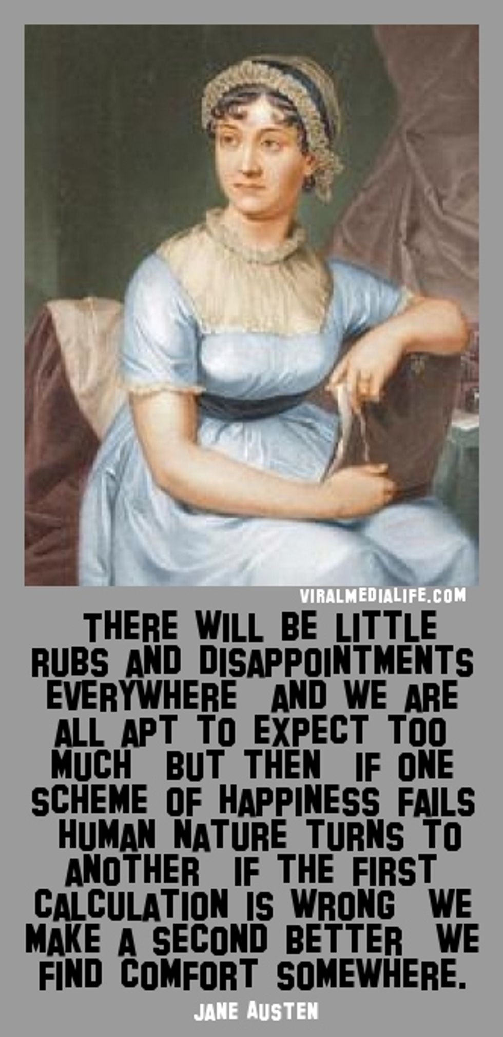“There will be little rubs and disappointments everywhere, and we are all apt to expect too much; but then, if one scheme of happiness fails, human nature turns to another; if the first calculation is wrong, we make a second better: we find comfort somewhere.”