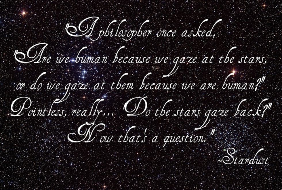 “A philosopher once asked, "Are we human because we gaze at the stars, or do we gaze at them because we are human?" Pointless, really..."Do the stars gaze back?" Now, that's a question.”
