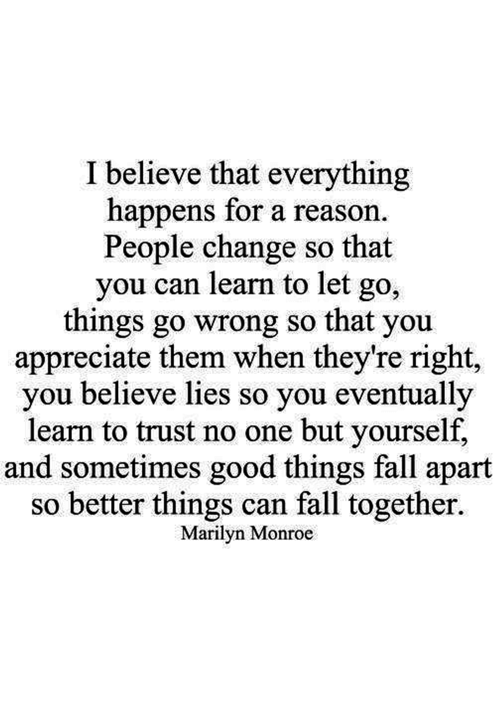 1. "I believe that everything happens for a reason. People change so that you can learn to let go, things go wrong so that you appreciate them when they're right, you believe lies so you eventually learn to trust no one but yourself, and sometimes good things fall apart so better things can fall together" -Marilyn Monroe