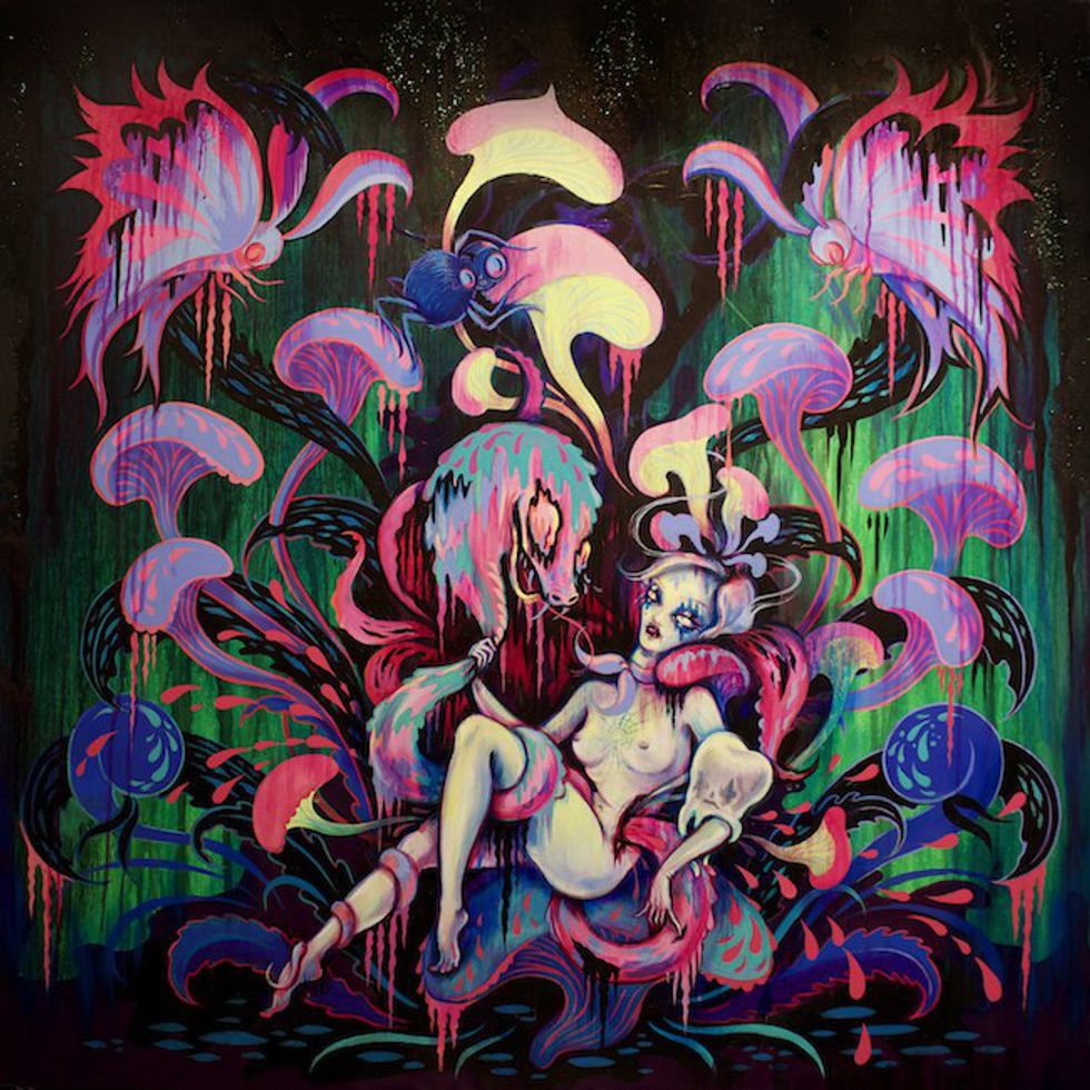 I personally have been following Garcia since 2011 when I discovered her in a book of modern art called The Upset. From my first look at her paintings I was completely enamored; from the subject matter to the colors, and of course the glitter. Garcia has also done full illustrated versions of both Snow White and Alice’s Adventures in Wonderland. Thankfully, Garcia’s paintings are not only satisfying visually, but as previously mentioned, carry a message. Often Garcia’s work is a statement on capitalism and the environmental destruction that comes with it. Recurring imagery such as mutated animals, evil-looking medications, and black oil-like substances lend a hand to this theme. Additionally, her work explores females specifically within this space.