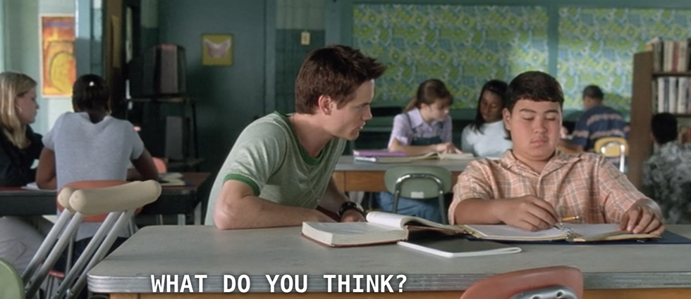 It's a screenshot from the movie "A Walk to Remember," one of those popular romance movies based on a Nicholas Sparks' novel. Seems pretty innocent, right? Just some people sitting in a classroom. If you've seen this movie, you'll know that this is one of the introductory scenes between the main character (green shirt) and the love interest (brunette girl in overalls). However, if you look closely at this film, you'll find that this scene happens to be the only one in the entire movie with multiple people of color in it -- and they're all portrayed as one-dimensional "disadvantaged kids."