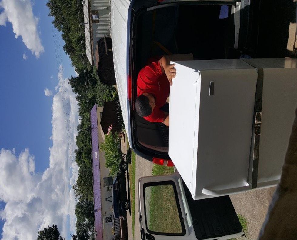 In this photo below, Raymond Lamb is shown moving his refrigerator: