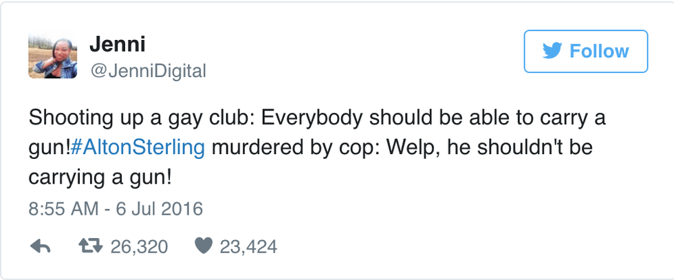 This tweet highlights the unspoken hypocrisy that is embedded into our criminal justice system: society believes white Americans should carry firearms in order to protect themselves; however, when black Americans carry firearms, society views them as a threat and an act of violence against the privileged white Americans. In the past week, two black males were murdered by unnecessary, overpowering police brutality. Although Philando Castile was legally allowed to carry a gun and Alton Sterling may have been, society condemned both men for exercising their freedoms of self protection and unlawfully killed them. There is no reason besides pure irrational prejudice against the black community that these men are dead.