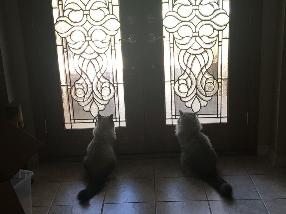 When you leave your house, you can peak through the window and see your dog placing himself at the front door so he can wait for his favorite human to return home. Same with these kitties. Nearly every day when I came home from school, they were there to greet me at the front door! Only difference was they didn't jump all over me to say hello.