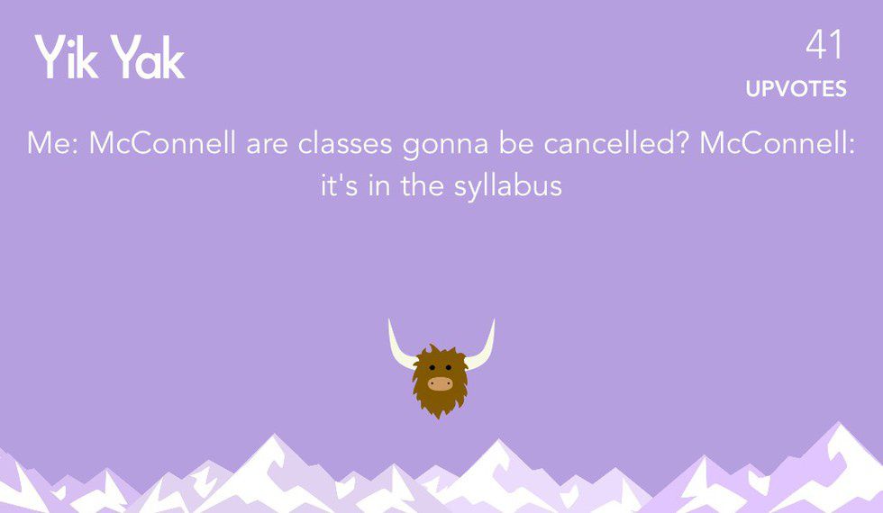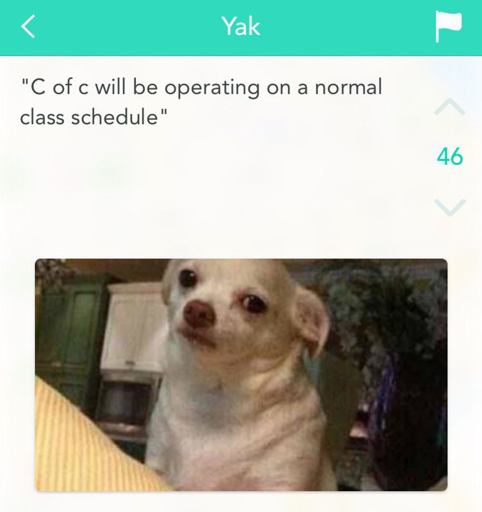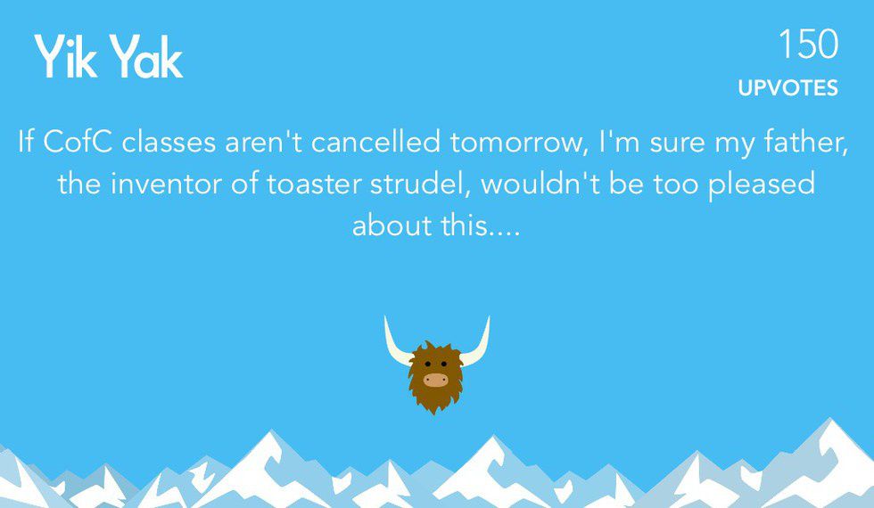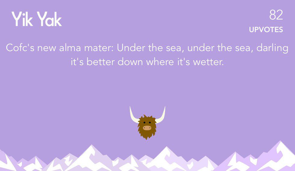 Unless you live under a rock, you probably noticed the insane rainy weather last week that left Charleston in a state of minor chaos. Roads were closed, mini lakes were forming all around campus, and Yik Yak was on fire. And really, what better way to stay updated on what's happening around campus than keeping up with the Yaks?