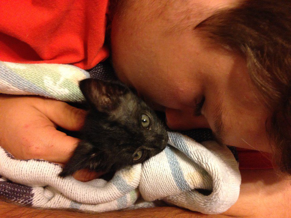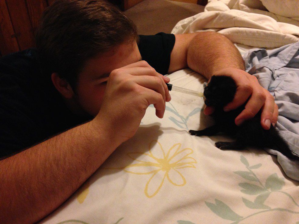 Here I am feeding the little one some formula with the dropper; it was amazing to see that this baby kitten was roughly the size of my hand! Amber and I soon realized we had to name our newest member of the Miller family! So we assumed that the kitten was a girl and because of the white diamond under the neck we decided that Diamond was a perfect fit! After all Diamond was just like a diamond in the rough!