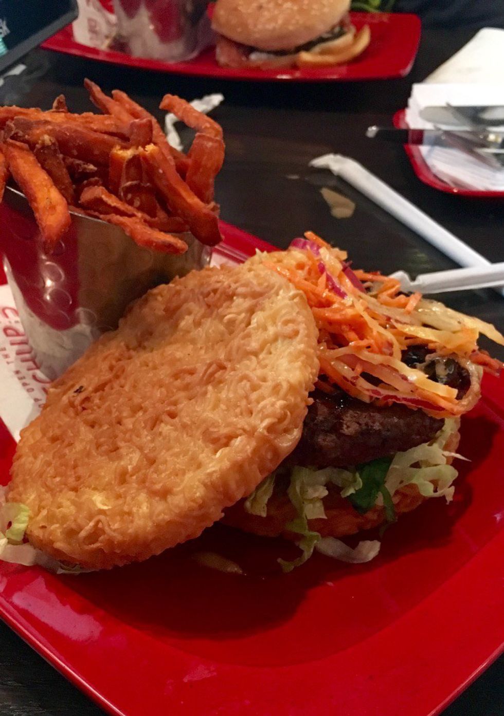 The noodle buns were crisp beyond belief, and I had to take one of them off to even bite into the burger (a lady at the table beside me had to do this as well). Once I could take a bite, my mouth was overwhelmed with the dryness of the noodles and patty itself (I had ordered it medium). Even if some of the flavors were enjoyable, it was impossible to find them over the overwhelming burnt oil taste that the bun gave off. To put this in the nicest way possible, everything tasted "blah."