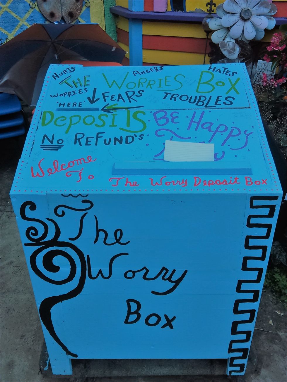 As we entered the gates and tried to take everything in, I stopped at the worry box. This waist high, bright blue, wooden box is the only thing in the whole garden that acknowledges anything negative. It instructs you to write down anything you're struggling with (hate, anger, sadness, worry...) and leave it behind. It inspired me to incorporate this into the devotional time my daughter and I have every morning.