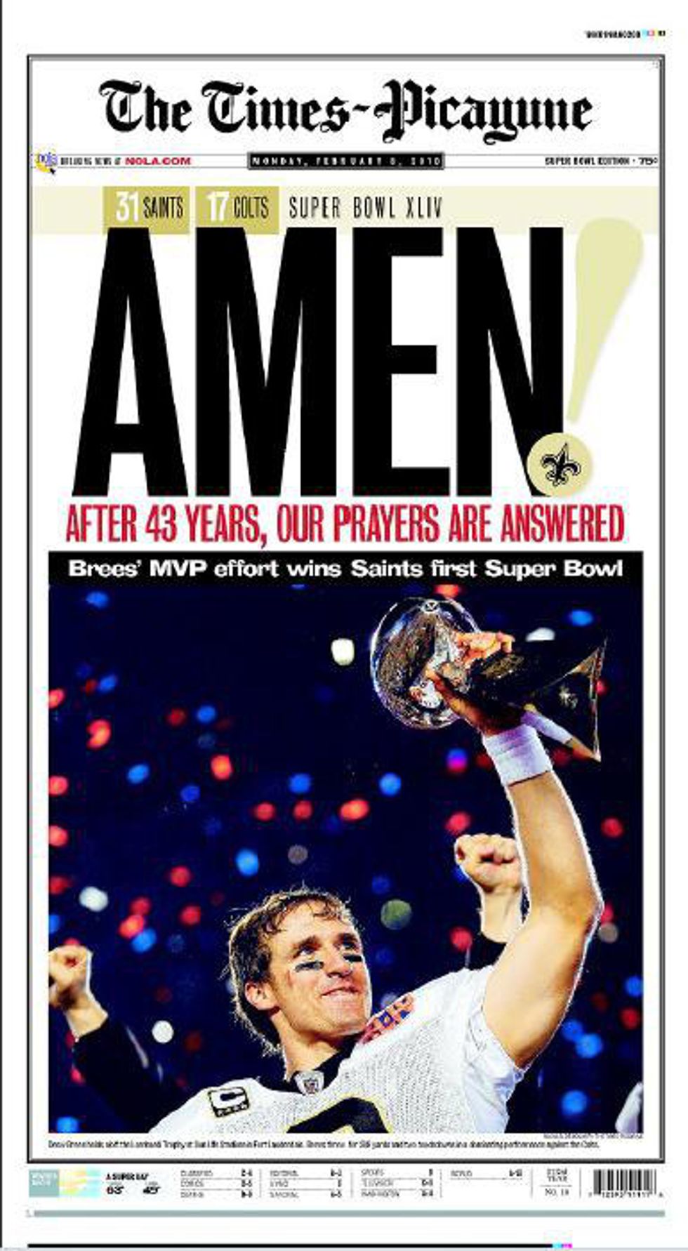 Even for non-Saints fans and non-football fans, the New Orleans Saints winning their first Super Bowl only four years after Hurricane Katrina was a tear-jerking moment for America. While Peyton Manning and the Colts weren't necessarily villains of the NFL, the Saints were the senti-mental favorite because of what the city went through. Indianapolis seemed to have the game in control when the Saints called a gutsy on-sides kick to start the second half which turned the momentum around. The Colts had a chance to come back while trailing late but a pick-six by Tracy Porter sealed New Orleans first title.