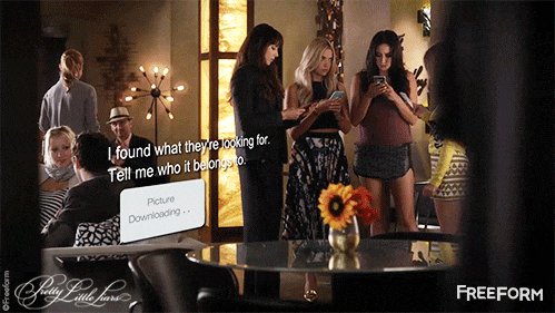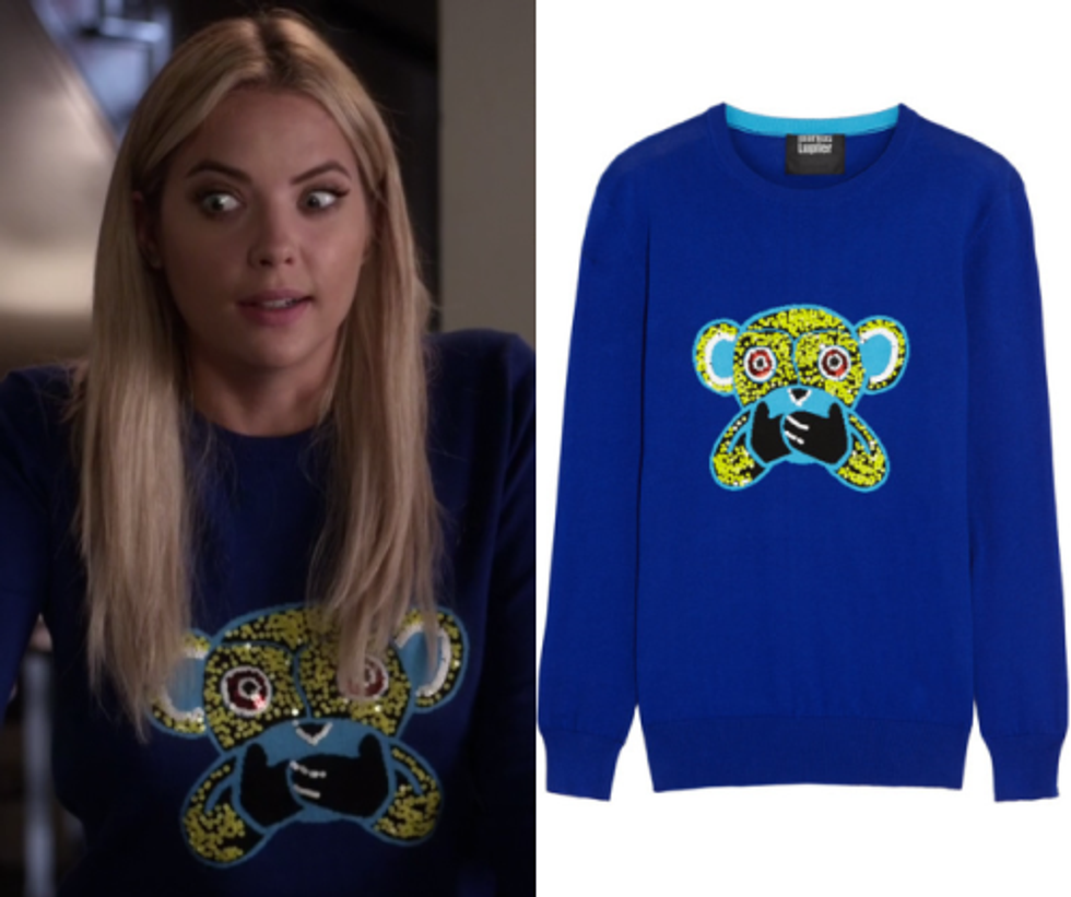 On Freeform "more adult" apparently means "more zoo animal themed clothing." In the most recent ep Aria chose for her subtle breaking-and-entering outfit this bright yellow sweater featuring two kissing zebra heads paired with a beaded yellow skirt.