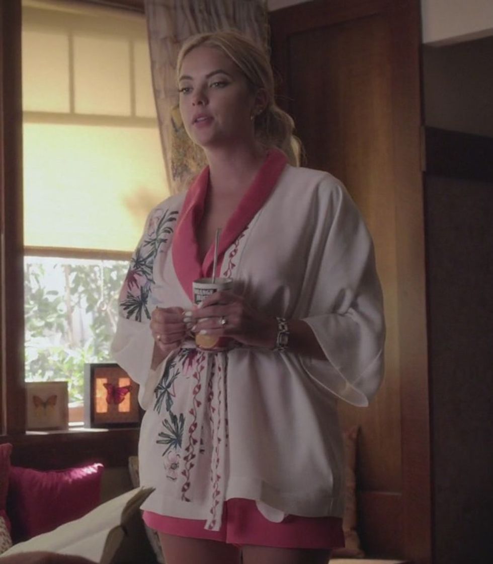 Hanna actually paired this ensemble with high heels and wore it out of the house. She wore it while eating popsicles at Spencer's, she wore it to her mom's fancy hotel, and she wore it on the group trip to accuse Ezra of murder. Apparently bathrobe rompers are the new chic look for New York fashion interns everywhere.