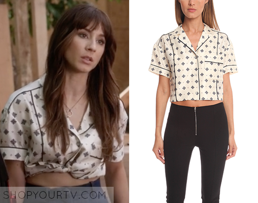 Aria has the best slogan outfits. Remember when she killed Shana and then wore pajamas that said "She's No Good"? Remember after she escaped from the Dollhouse and then wore a dress printed with "Stop Men"? Now in the hip and fresh world of Freeform she's apparently chosen to embrace her inner spiritual gangster.