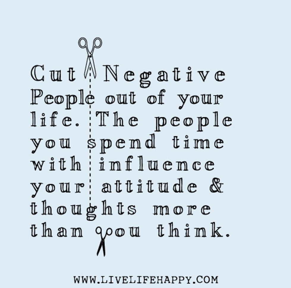 I've seen it on every social media outlet I have. It's the common tweet with thousands of favorites, the Facebook status with hundreds of shares, and even the Instagram caption to the ordinary selfie. For a while now, the idea of removing negative people from your life has become all the rage just about everywhere. Because who wants to hang out with someone who is gloomy all the time? Or complains all the time? Or doesn't see the glass as half full?