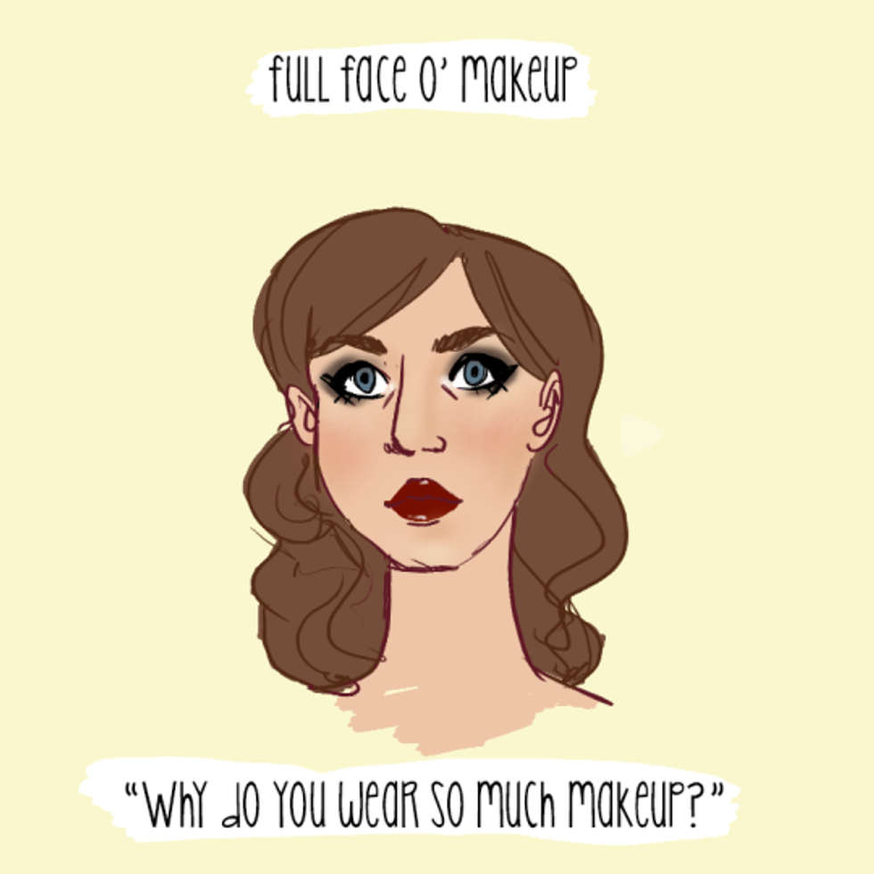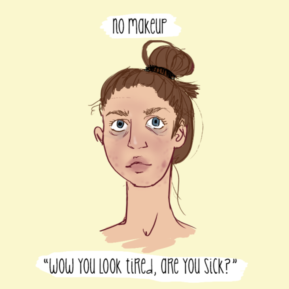I feel like it's almost expected for women to wear at least a little bit of makeup, but they can't wear too much or else they're being a 'tramp'. People always say they prefer the natural look girls, but that look isn't 'natural' in the way they think of it--the natural look is eyeliner and mascara and foundation a variety of other things. If they don't do this, people ask if they're sick, or if something's wrong because they look tired. In a professional setting, I imagine this happens a lot, because if you go a day without makeup you're seen as not caring about yourself or how others see you, apparently. This comic is a great example: