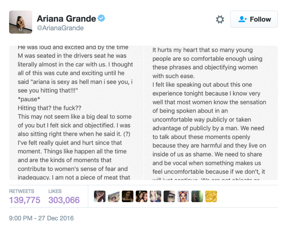 Ariana Grande was recently sexually harassed when she was spoken about by a fan of her boyfriend (Mac Miller) in a completely inappropriate manner right in front of her face.