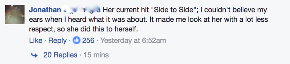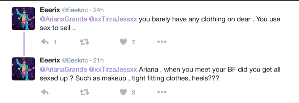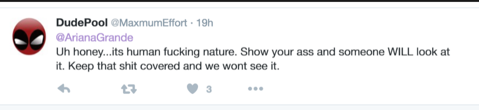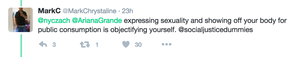 Let me break this down for you. Ariana Grande is comfortable enough in her own skin to wear little outfits. That does not mean that random strangers get a free pass to say or do disgusting things to her. She sings about sex. So what? She’s walking side to side because she’s been here all night and all day with a boy she gave her consent to. She wants a little less conversation and a little more touch-her-body with someone who has her consent. This should not be difficult. At all.