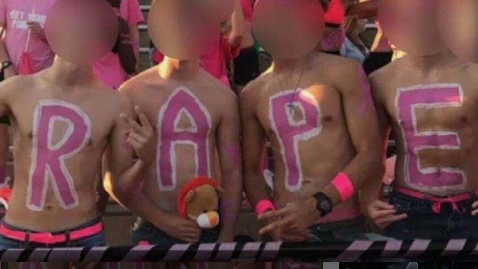 The theme for this football game was "touchdown for cancer" to raise awareness for breast cancer. At this football game, these four boys (who had already been painted with letters) rearranged themselves to spell out the word "rape" and proceeded to take pictures and posted them on Snapchat. Now, the word "rape" was directed at the quarterback of the team; however, that does not make this any less serious because rape happens to boys & men too. Not only was this not funny, but it was also very offensive due to the fact that this game was supposed to raise awareness for breast cancer. Now, it is merely known all over the internet as the game where four boys spelled out rape.