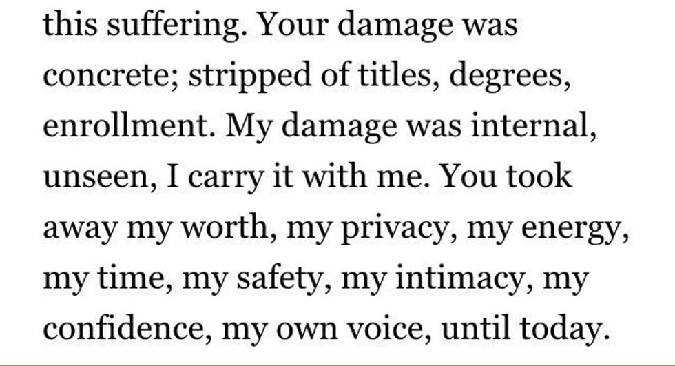 When I was 14, I was sexually assaulted by a rapist just like you. I'm not here to tell you the details, I'm not here to explain to you what it was like being conscious during the event. I'm simply here to tell you about the aftermath. Because now It's been five years, I'm 19, soon to be twenty. And I'm still alive. But it hasn't been easy, Brock.
