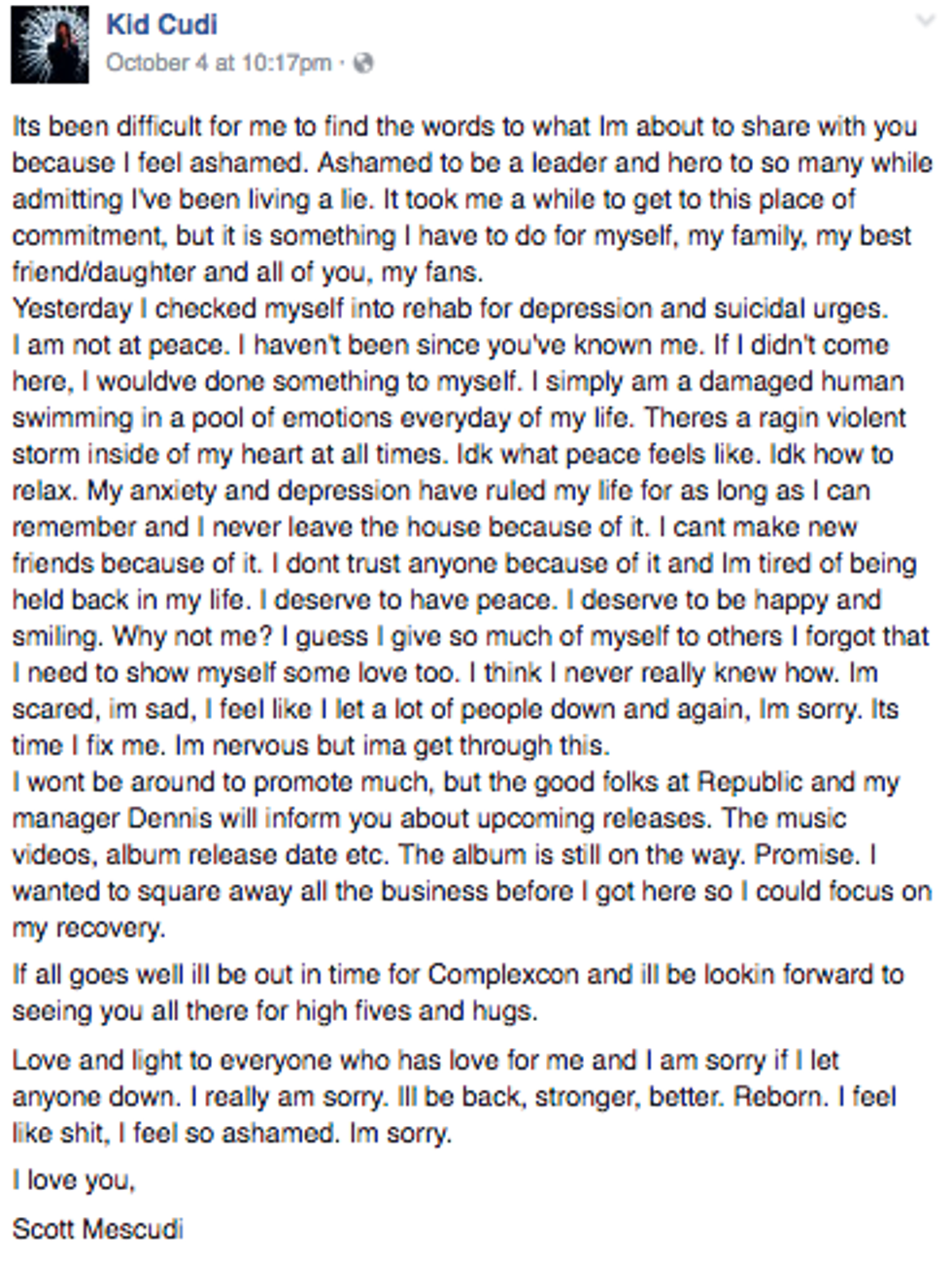 Late night on October 4, Cudi admitted on his Facebook page that he had checked into rehab for both his depression and anxiety, conditions he claims have been affecting him his entire life. In addition to this update, Cudi delivered an apology to his fans, signing off with his legal name, Scott Mescudi. Cudi’s raw emotion left a deep impression with his followers; the post has been liked more than 576,000 times, shared more than 136,000 times and received over 56,000 comments on Facebook alone.