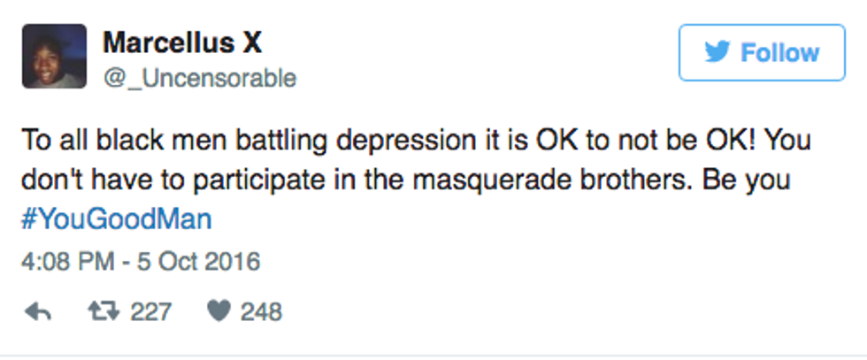 However, we are also told one’s value remains influenced by their skin color, and in a society where the Black community has to riot in the streets to be heard, there are unique factors that contribute to Black mental health that America isn’t properly acknowledging. There’s a stigma to being depressed that multiples for our men. We don’t give one another consent to be vulnerable, and for men we call that behavior “weakness.” We’ve been raising our sons, encouraging our brothers, and urging our friends to “man up” and swallow their own inner turmoil. We have given them the options to either admit defeat or suffer in silence. In both nonverbal and verbal ways, we never stop telling men to avoid vulnerability, and then one day it becomes their default.