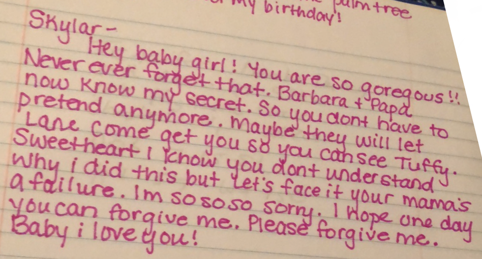 In her note, she says she knows I don't understand why she committed suicide. Well at nine years old of course I didn't understand why she would do that. I didn't even completely understand what exactly happened.