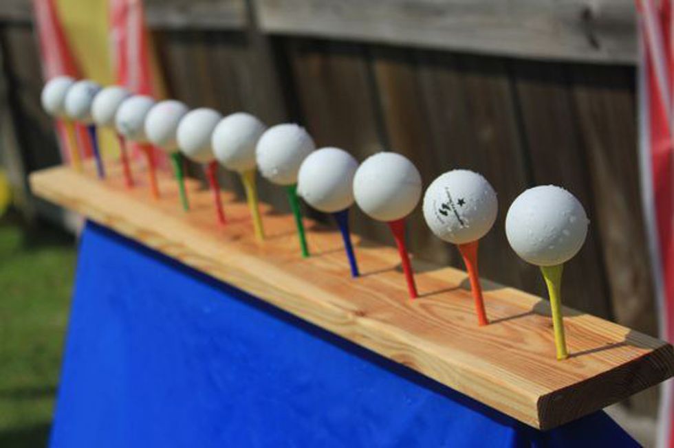 Set up the bench seat and stick in the golf tees. Place the ping pong balls on the top of the tees and fill up those water guns because the fastest person to knock down the ping pong balls will be the winner! It is easiest if each person goes separately.