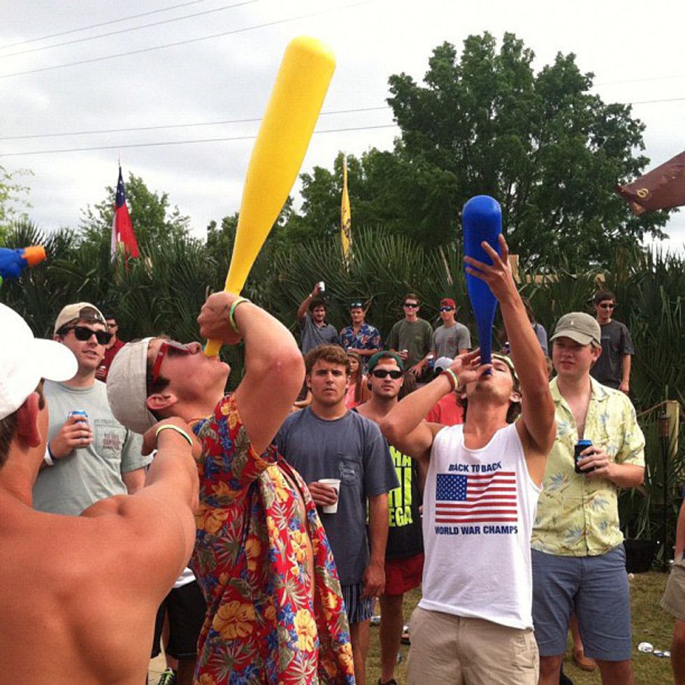Cut the end of the handle of the wiffle bat. Each player will pour a can of beer into the bat and then drink it. However many seconds it takes to drink the beer that player will have to spin around the bat. Another player then has to toss an empty beer can while they try and hit it in their drunken dizziness. The first team to finish the relay with all of their player successfully hitting the empty beer can wins.